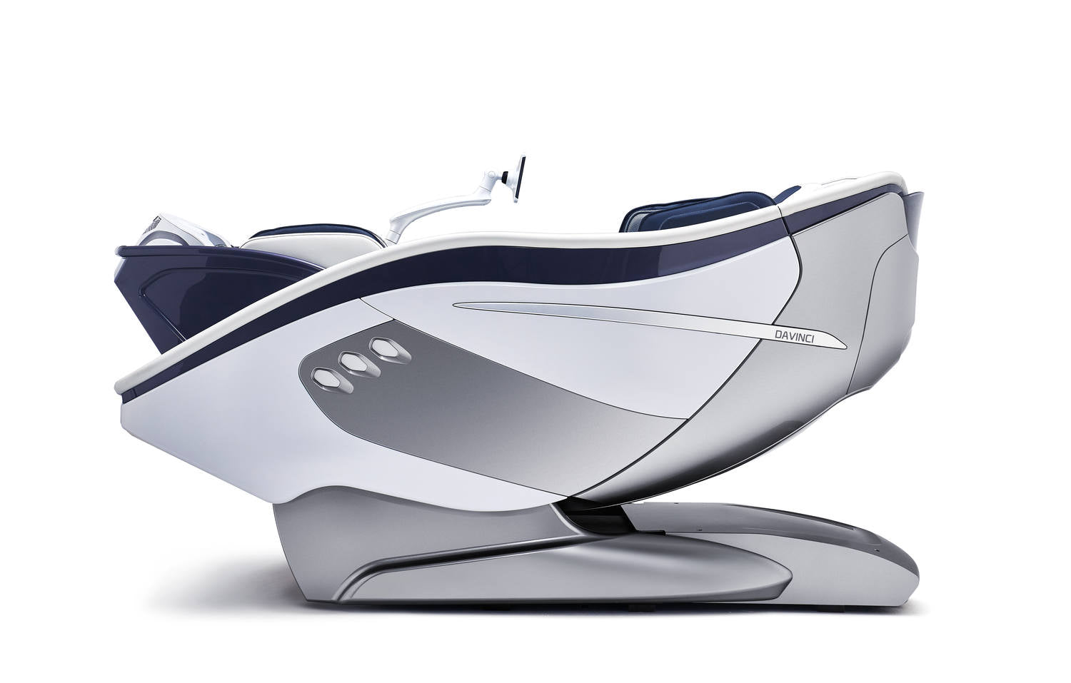 „DaVinci war ein herausforderndes Projekt. Es hat uns dazu gebracht, unsere Erfahrung bei der Gestaltung von Technologien mit Konsistenz und Ausgewogenheit voll zum Ausdruck zu bringen. DaVinci ist kompakt, ikonisch, rational und unverwechselbar und verfügt über einen klaren „Cocooning“-Effekt, eine umhüllende und schützende Hülle mit eleganter Ergonomie, zum Entspannen und vor allem zum Profitieren von den vielfältigen Funktionen, mit denen DaVinci ausgestattet ist. Die für DaVinci verwendete Farbpalette bezieht sich auf die medizinische Welt, mit Blau, der Farbe für Sanitär und Wellness, und Weiß, der idealen Farbe für den medizinischen und technischen Bereich. Die metallisch grauen Komponenten verweisen auf unsere zahlreichen Automobil-Forschungsprototypen. Generell gibt es einen expliziten Bezug zur Automobilwelt, erkennbar an Merkmalen wie den Seitenlichtelementen, die anzeigen, welche Art von Massage gerade aktiviert ist, oder dem Spin direkt unter der Fußstütze.“